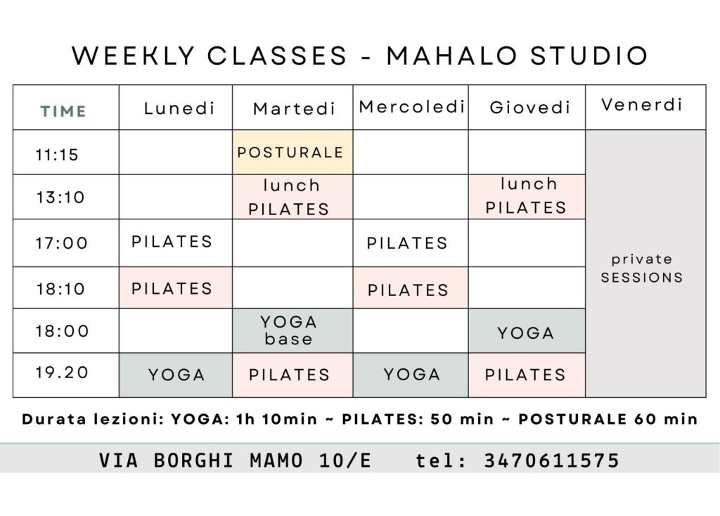 Orario delle lezioni: si chiede di arrivare 5/10 minuti prima del corso (non troppo in anticipo in quanto la sala potrebbe essere occupata dal corso precedente) in modo da poter iniziare la lezione in orario. La porta di ingresso verra’ chiusa all’inizio della lezione e NON sara’ più possibile entrare oltre tale orario.