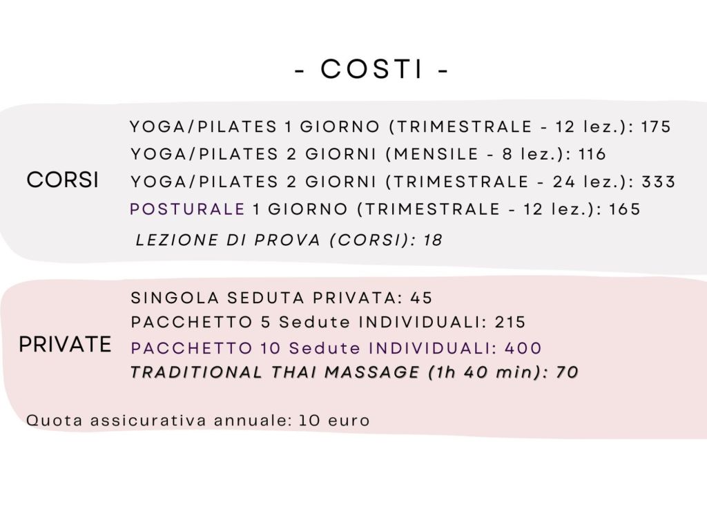 I pagamenti per gli abbonamenti (e lezioni individuali) vanno effettuati prima dell’ inizio del corso. Ogni abbonamento ha una scadenza predefinita, la cui data viene inviata al momento dell’iscrizione, tramite WA o mail. Una volta scaduto l’abbonamento, non è possibile prorogarne la validità salvo rinnovo. Nei periodi di chiusura dello Studio verra’ prolungata la validità dell’abbonamento. Non e’ possibile cambiare i giorni scelti nell’abbonamento al momento dell’iscrizione. Cancellazioni: se non puoi partecipare ricordati di avvisare almeno 2 ore prima dell’inizio.